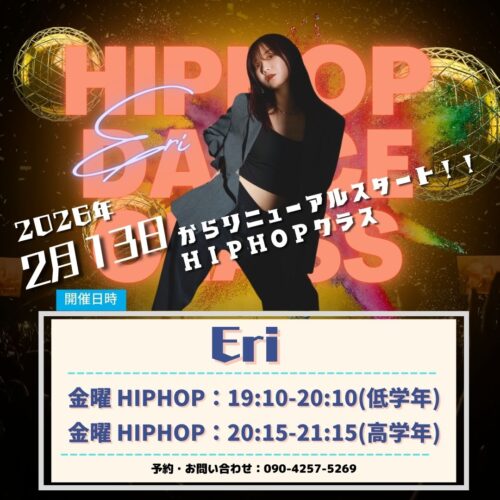2月13日(水)から【キッズHIPHOPクラス】がリニューアルしました✨️ 担当は、Eri先生です! 金曜 HIPHOP 19:10-20:10(低学年) 金曜HIPHOP 20:15-21:15(高…